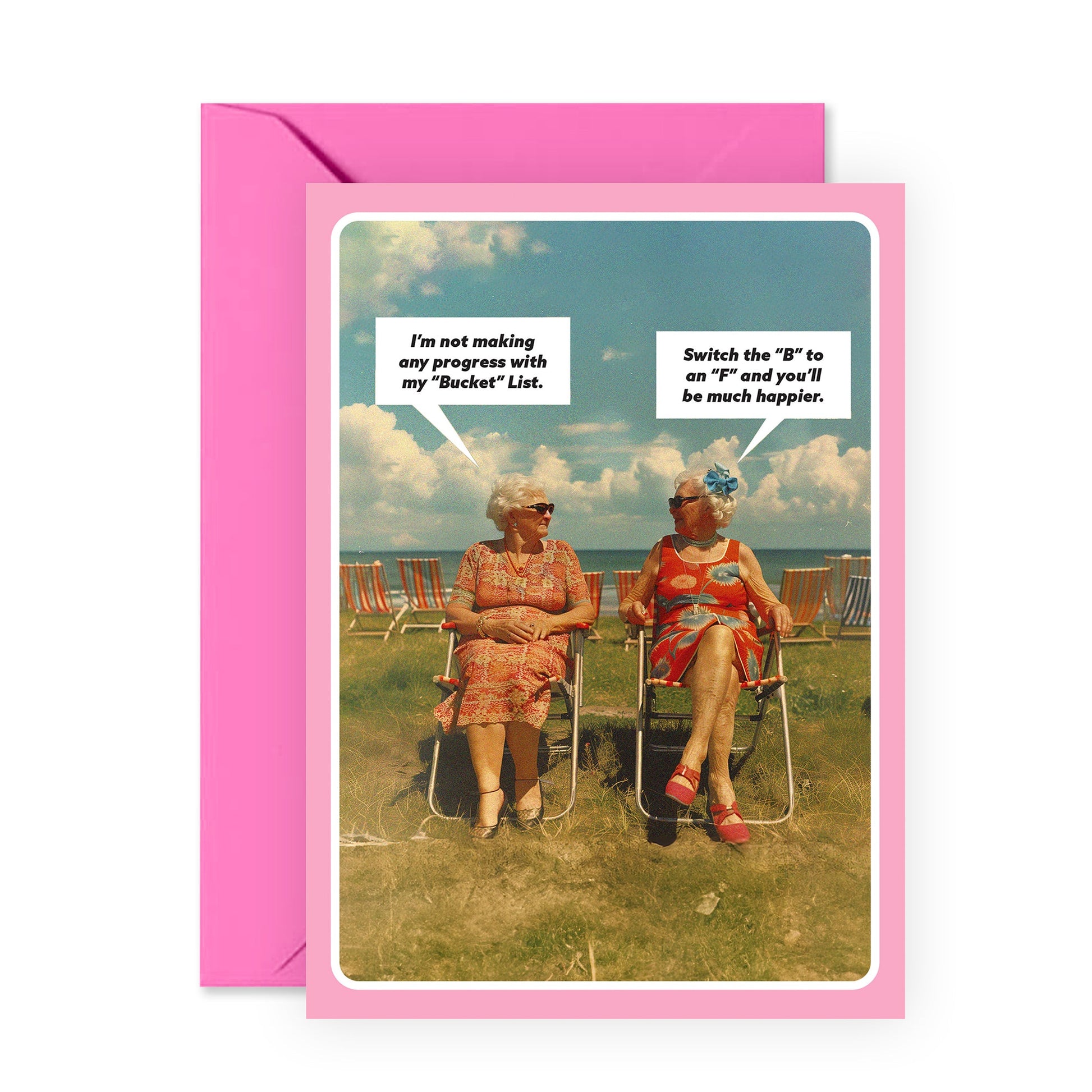 Funny Retro Birthday Card - Bucket List - Hilarious Greeting Card For Women - Sister Cousin Grandma Mom - Best Friend - Comes With Stickers