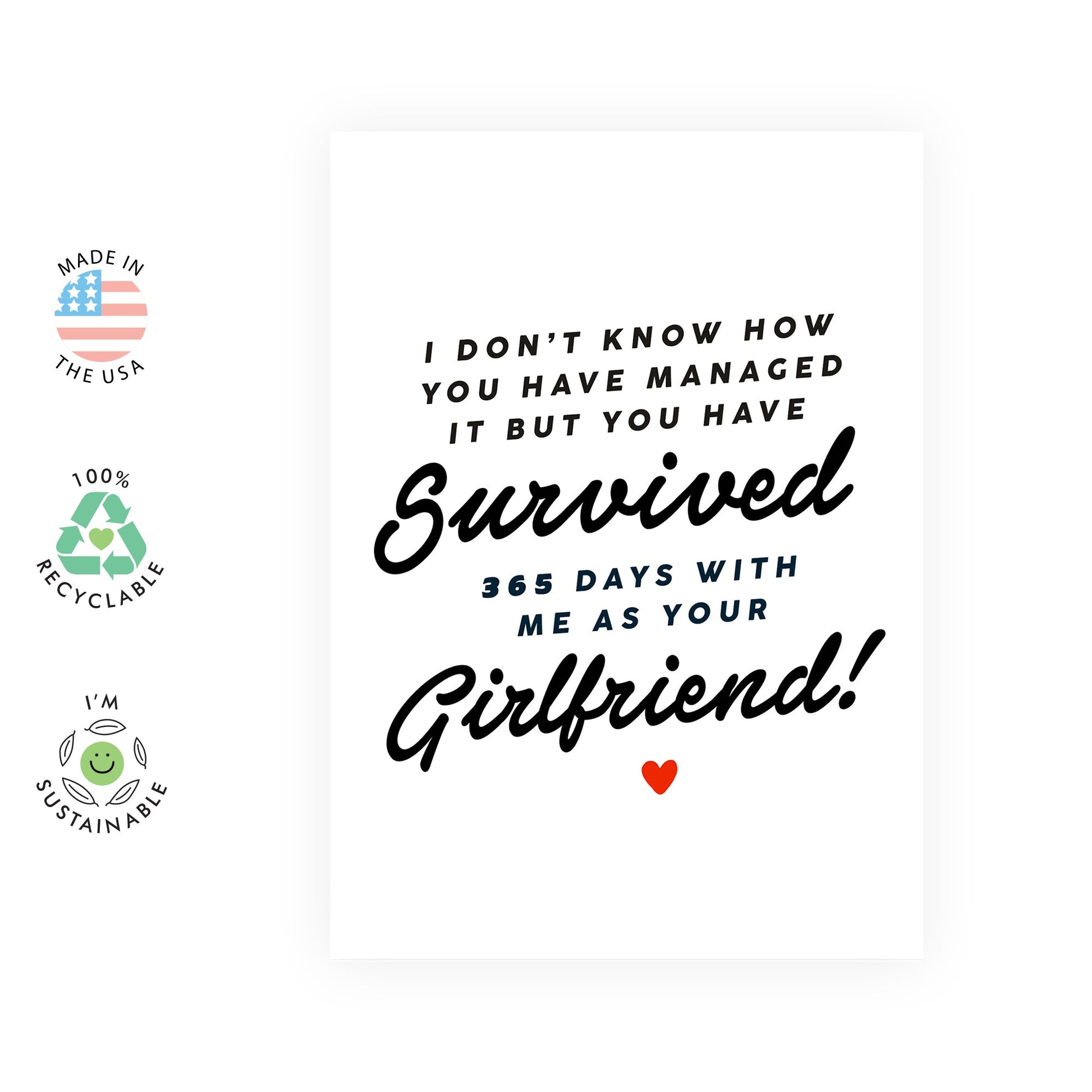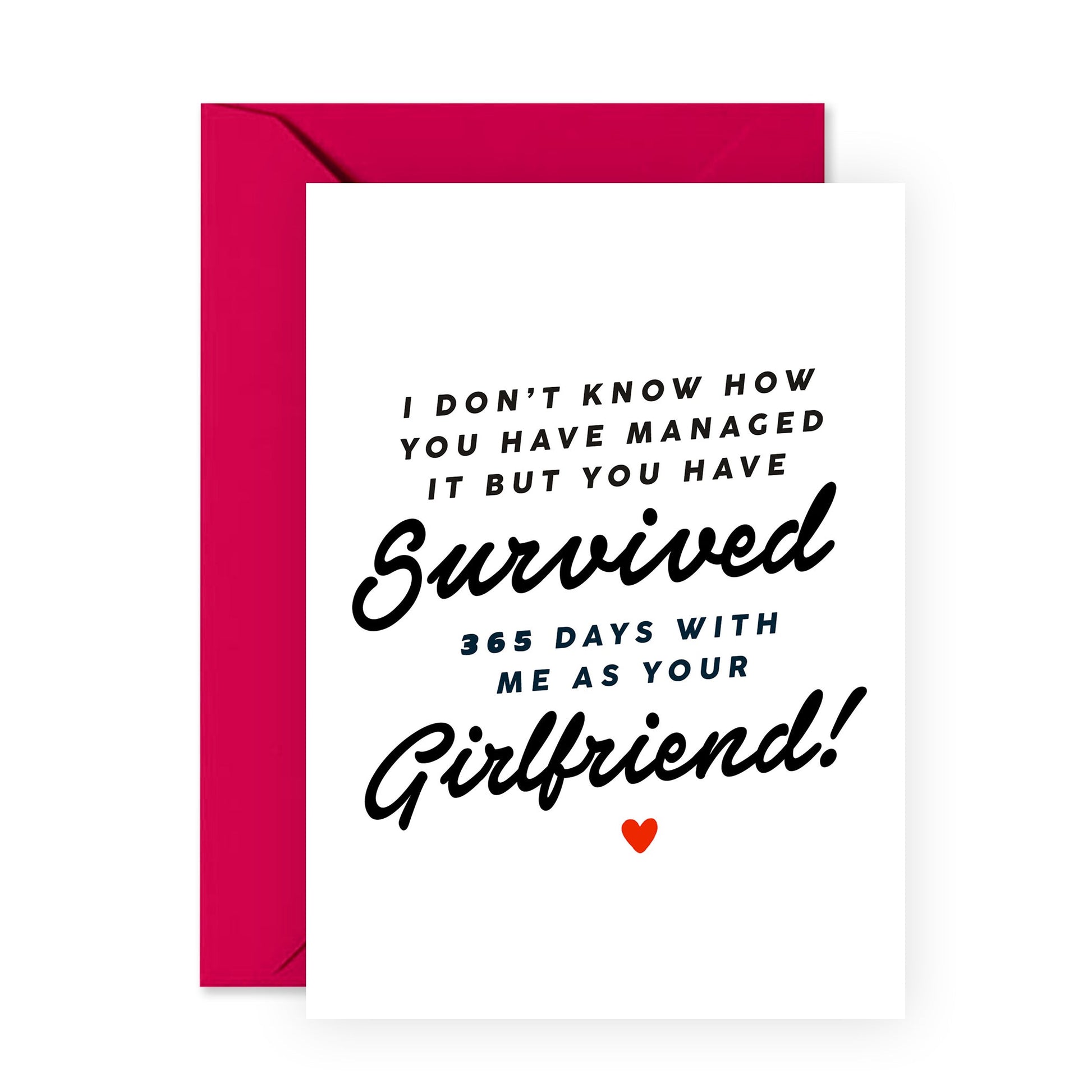 Funny Anniversary Day Card - '1 Year GF' - Romantic Gifts for Boyfriend, Boyfie, Partner - Thanks for Staying - Comes with Fun Stickers