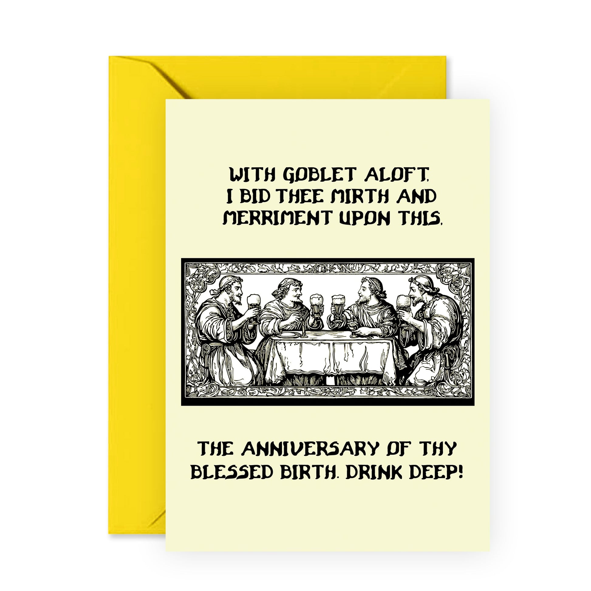 Medieval-Themed Funny Birthday Card Women Men – ‘With Goblet Aloft, I Bid Thee Mirth and Merriment’ – Gifts for History Buffs, Beer Lovers, Dad, Uncle, Grandpa, Professor - Comes with Stickers